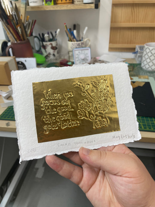 All my embossings, collages and paintings are created by hand. The embossings are often finished with ink, so although part of an edition or open edition each one is unique and thought through. Taking inspiration from small moments of the everyday my work explores these elements through print and paper.
