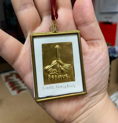 Breathe Gingko embossing in brass frame 5cm x 7cm